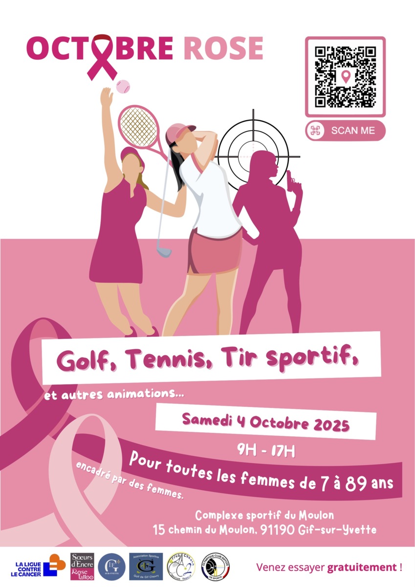 À l’occasion d’Octobre Rose, trois clubs – Golf, Tennis et Tir sportif – s’unissent pour organiser une journée découverte exceptionnelle au complexe du Moulon. Sport, partage et solidarité seront au rendez-vous pour sensibiliser et soutenir la lutte contre le cancer du sein.